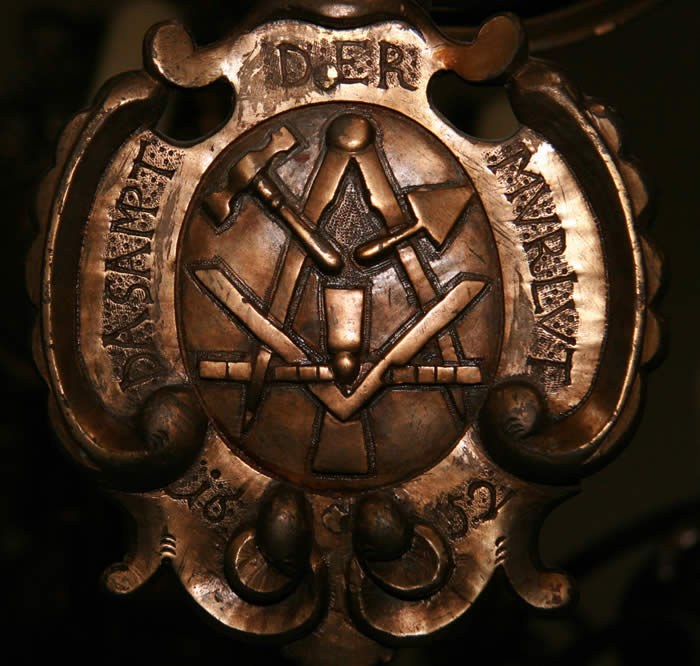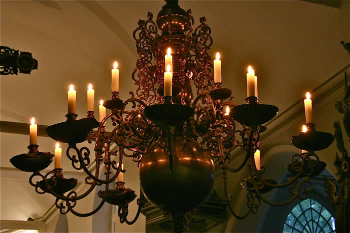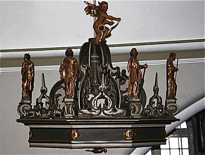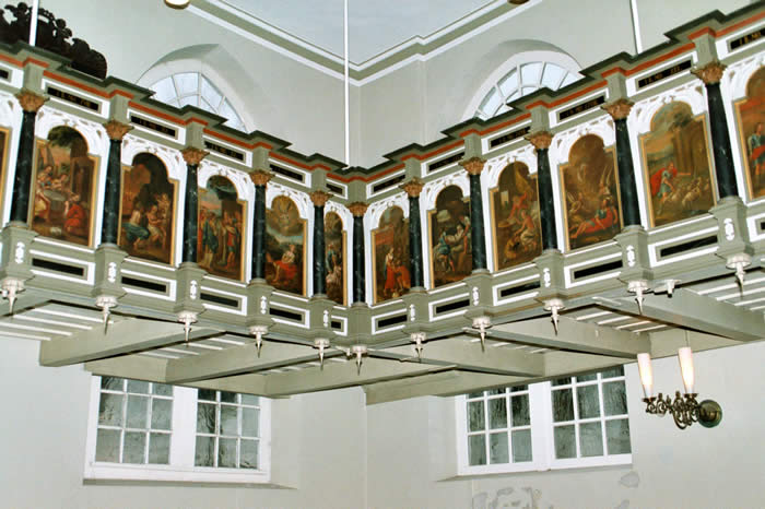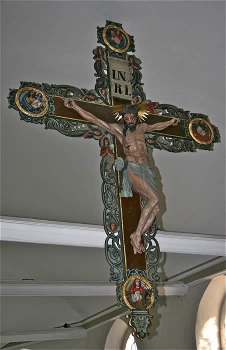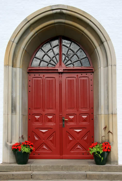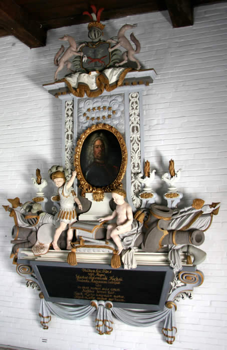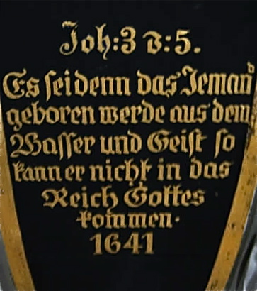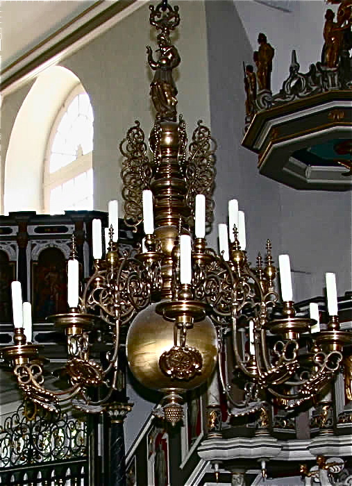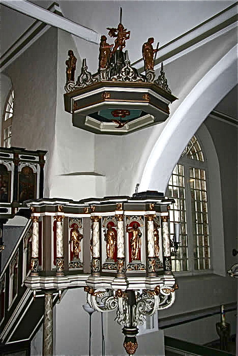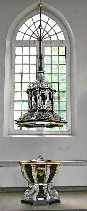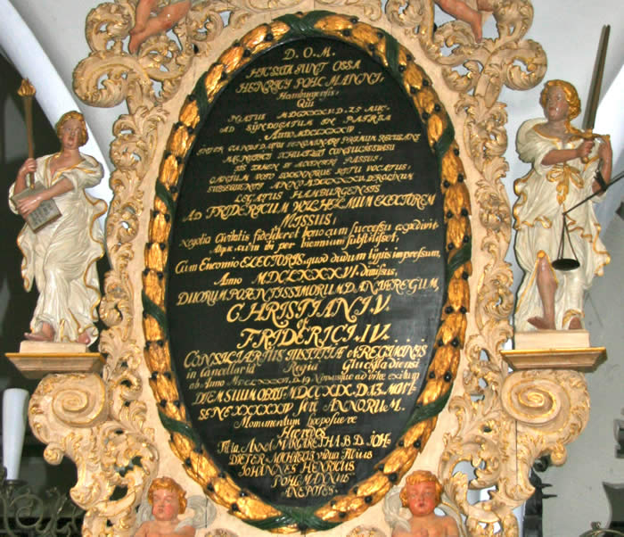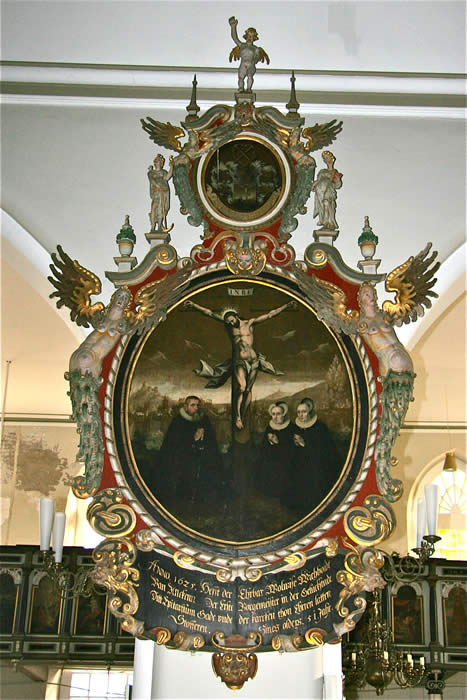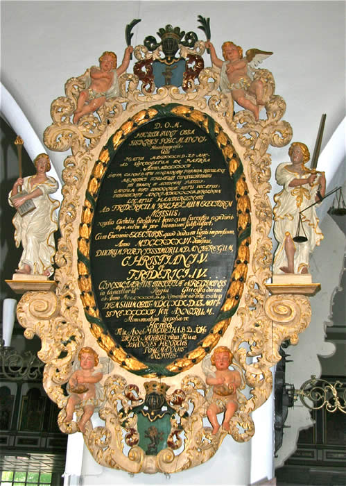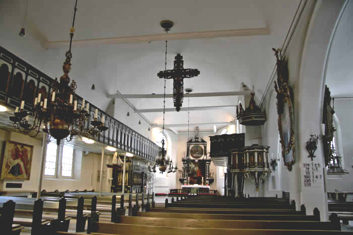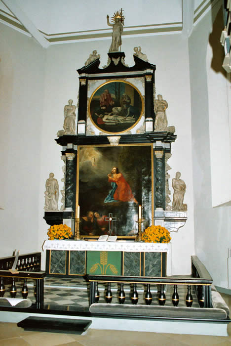 Altar: Tisch mit der Inschriftenplatte Christians V., verdeckt durch das Antependium (Altarbehang in den Farben des Kirchenjahres – Advent: violett, Weihnachten: weiß, Passionszeit: violett, Ostern: weiß, Pfingsten: rot, Trinitatis: grün).