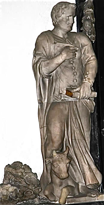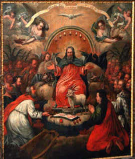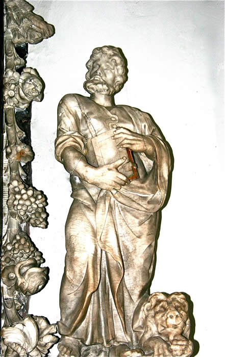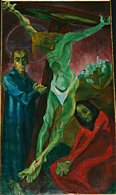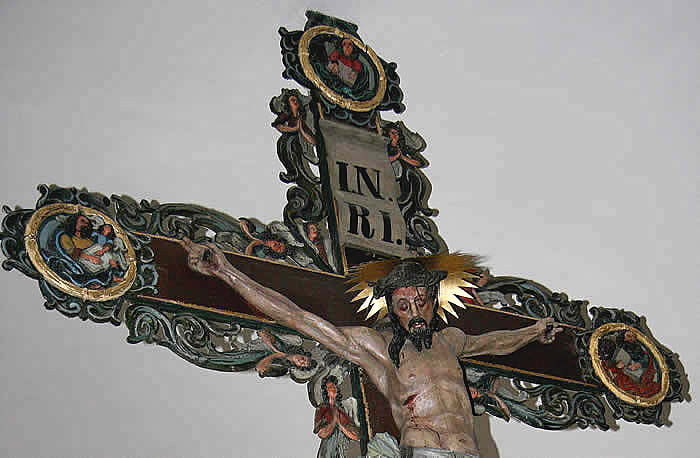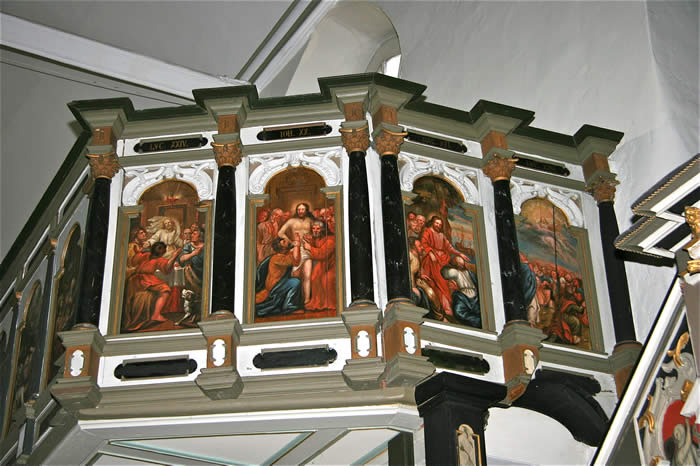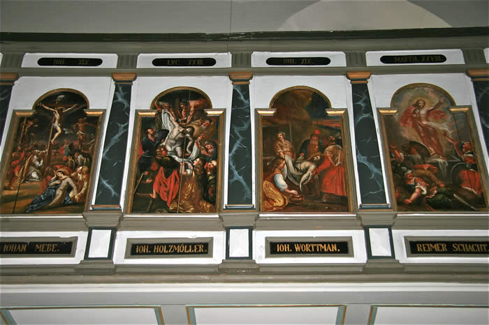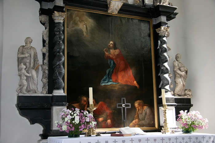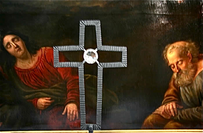 Großes, rechteckiges Bild unten: Jesu in Gethsemane, von den schlafenden Jüngern allein gelassen – Sinnbild für die Situation zwischen Gott und den Menschen, die gekennzeichnet ist durch die Trennung, Entfernung, Abstand, Sünde inhaltlich und etymologisch verwandt mit Sund, Absonderung.