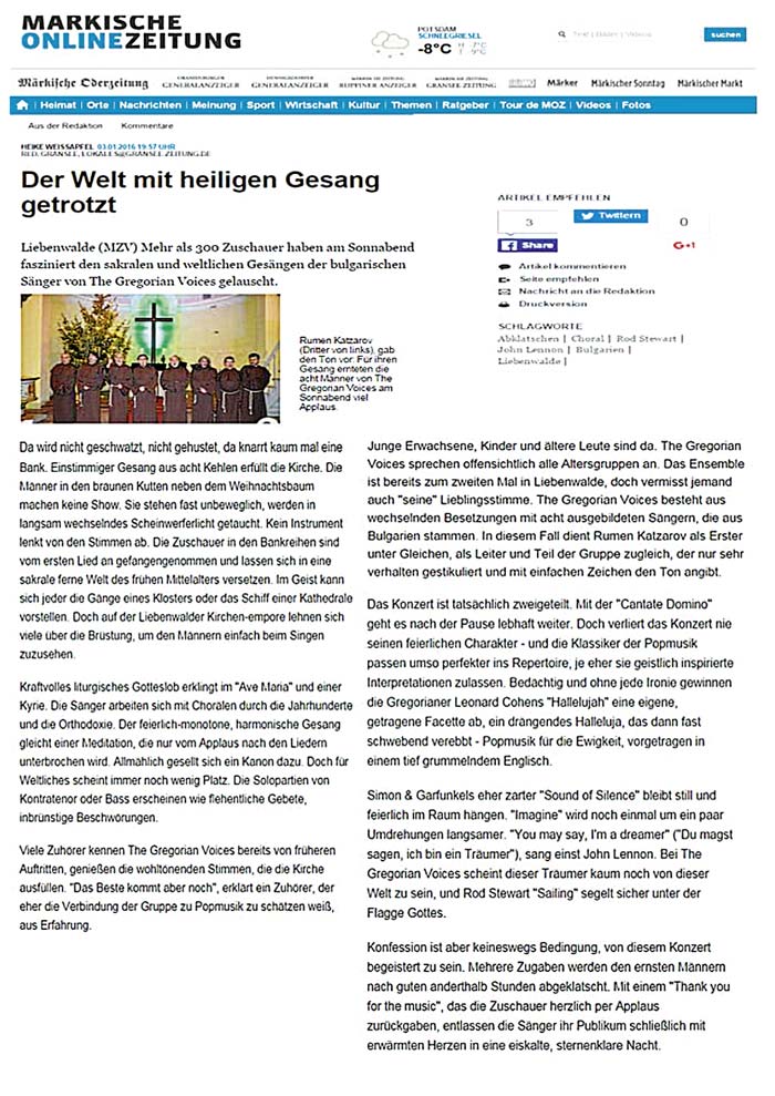 Seit dem Frühjahr 2011 ist die Gruppe THE GREGORIAN VOICES mit ihrem Leiter Georgi Pandurov und acht außergewöhnlichen Solisten auf Tournee in Europa. Das Ensemble erhielt mehrere internationale Auszeichnungen. Außerdem wurde den Mitgliedern der Gruppe die seltene Erlaubnis zuteil, während der Konzerte Mönchsgewänder zu tragen.